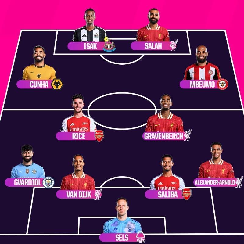 Opta英超赛季最佳阵容:萨拉赫领衔,红军4人枪手2人 admin 2025年05月26日 05:30 102 0 直播吧5月26日讯 本赛季的英超联赛已经落幕,Opta数据公司评选出了赛季最佳阵容,如下:门将:塞尔斯(诺丁汉森林)后卫:格瓦迪奥尔(曼城)、范迪克(利物浦)、萨利巴(阿森纳)、阿诺德(利物浦)中场:库尼亚:(狼队)、赖斯(阿森纳)、赫拉芬贝赫(利物浦)、姆贝莫(布伦特福德)前锋:伊萨克(纽卡斯尔联)、萨拉赫(利物浦) 标签: #利物浦 #赫拉芬贝赫 #阿森纳 #萨拉赫 #萨利巴 #赛季 #Opta #曼城 #塞尔斯